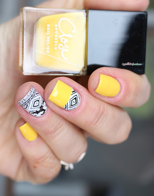 Histoire de la jouer summer vibes jusqu'au bout j'ai opté pour la star des nailarts estivaux : la manucure aztec. Tout en sobriété, noir, blanc, jaune. Pour celles qui ont du mal à porter cette couleur c'est l'association la plus "facile". J'ai fait un stamping avec les plaques Moyou London Tropical 23 (sur le majeur) et 17 (sur l'annulaire). Pour le majeur j'ai stampé sur base blanche puis j'ai posé le jaune à main levée (pas de patience pour le tape, ça ne change pas ^^).